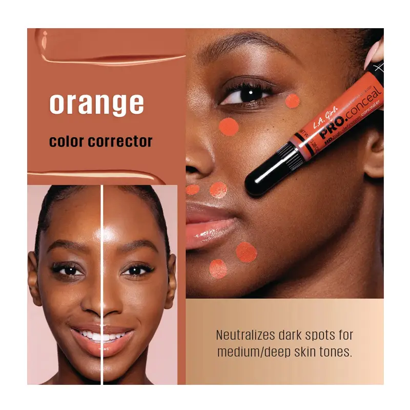 LA Girl ORANGE COLOR Pro HD Conceal Corrector. Crease-resistant with opaque coverage in a creamy, lightweight texture. Neutralizes Dark spot for medium/deep dark skin tones. Provide complete, natural-looking coverage, even skin tones. A brush tip applicator makes placement easier. Ideal for all skin types.